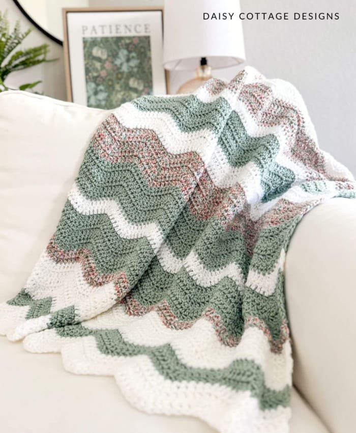 If you’d like to adjust the size of this blanket, too, this ripple blanket crochet pattern can be scaled up or down. It includes 6 different sizes, plus instructions for making a custom size.