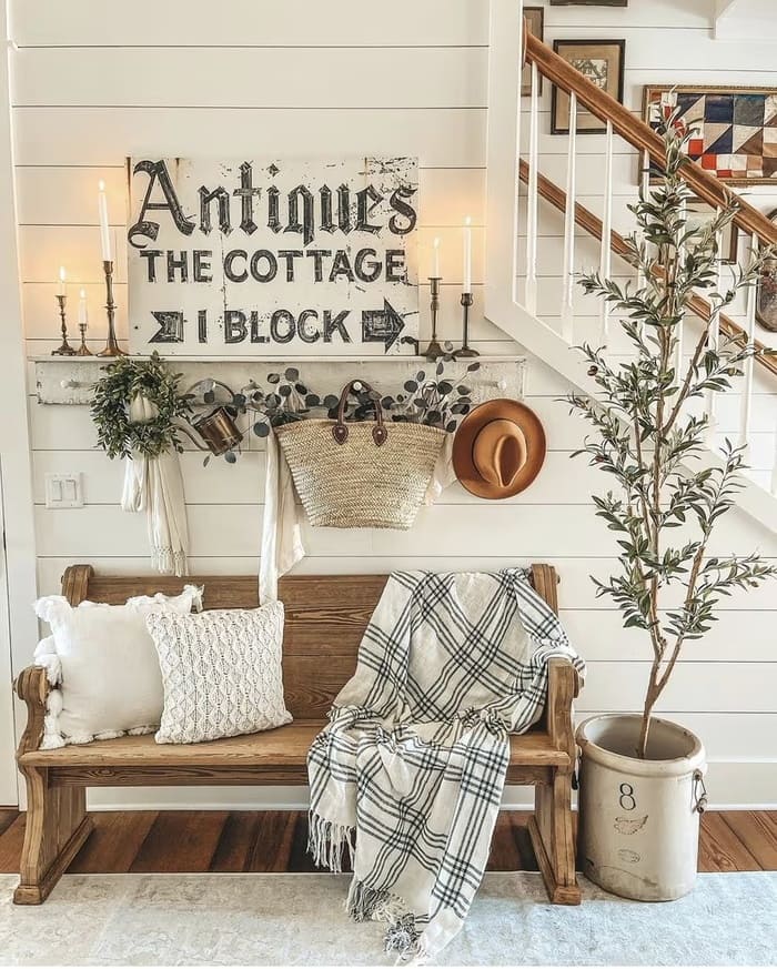 This farmhouse wall decor idea lets a vintage market sign steal the show. It sits right on the shiplap and instantly gives your walls that cozy, collected look. Add a few wall hooks, a touch of greenery, and soft candlelight, and suddenly your walls feel warm, welcoming, and full of farmhouse charm without trying too hard.