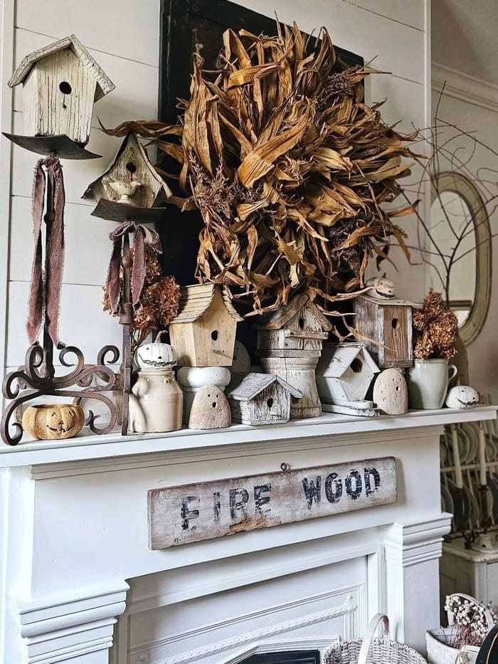 This farmhouse wall decor idea turns the wall above the mantel into a full display moment. Weathered birdhouses, dried corn husks, and soft neutral tones layer together to give the wall texture and charm. It feels collected, a little rustic, and very farmhouse, like pieces were added slowly over time and just naturally belong together.