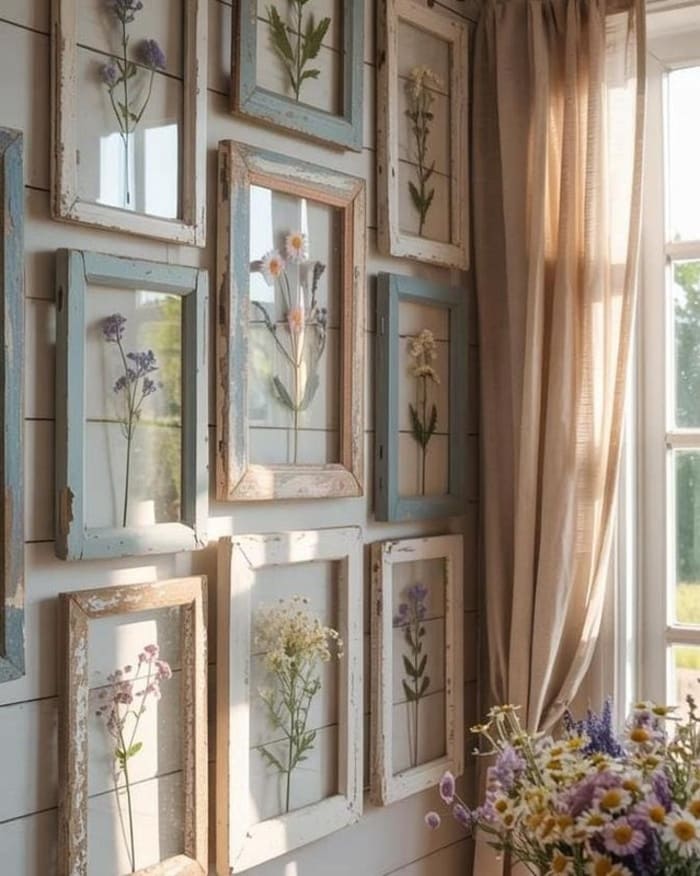 This farmhouse wall decor idea uses a collection of soft, distressed frames filled with pressed flowers to create a wall that feels calm and collected. The mix of pale wood tones and simple florals gives your walls a gentle, vintage look. It feels light, natural, and quietly charming, like something you slowly gathered over time and never want to take down.