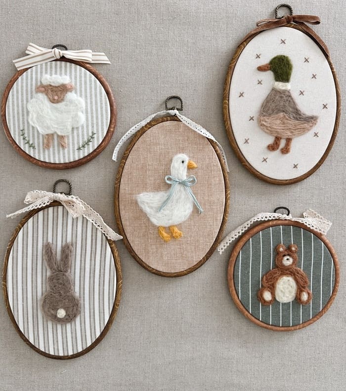 This farmhouse wall decor idea uses handmade embroidered hoops to bring softness and charm straight to your walls. The mix of gentle textures, neutral fabrics, and sweet animal shapes makes the wall feel cozy and personal. Hung together, they create a warm farmhouse moment that feels thoughtful, nostalgic, and just a little bit whimsical without feeling childish.