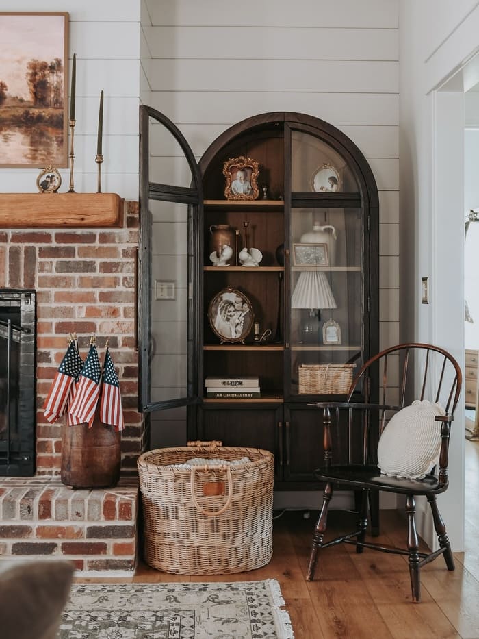 This farmhouse wall decor idea uses a tall arched cabinet to turn the wall into a quiet focal point. The curved shape softens the shiplap and instantly adds character. Filled with simple frames and collected pieces, the wall feels warm and intentional. It’s a beautiful way to add farmhouse charm while keeping the space feeling calm and grounded.
