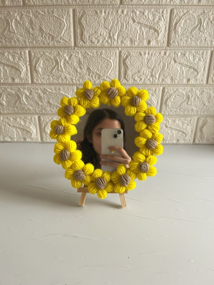 This crochet daisy mirror frame feels cheerful, creative, and full of personality. The bold yellow flowers instantly brighten the space, while the soft yarn texture keeps it warm and handmade. It’s a fun décor project that works beautifully for desks, shelves, or as a gift idea and feels playful without being overwhelming.