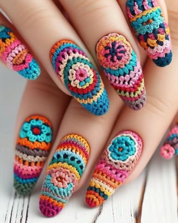 This crochet nail art is bold, creative, and full of tiny stitched details that feel like wearable fiber art. The layered florals, rich textures, and bright color mixes make each nail feel unique while still working together. It’s a fun inspiration piece for crochet lovers who enjoy pushing creativity in unexpected ways.