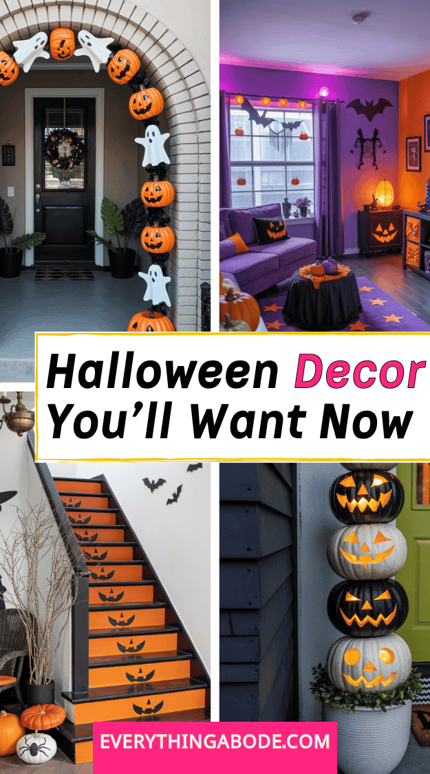That can mean a pumpkin-packed porch, a staircase full of bats, a kitchen with an orange glow, or a pink skeleton setup that feels a little unexpected.