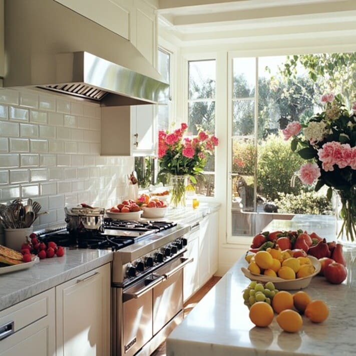 Styling tip: A simple jar of wildflowers on the kitchen island or a potted kitchen herb garden on the windowsill instantly softens the space.