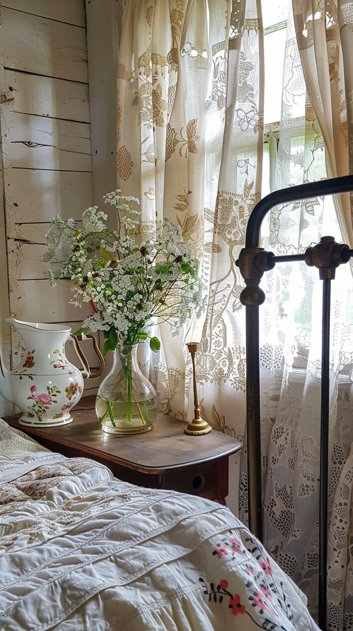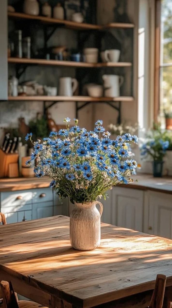 Vase Variety: Use mismatched vintage pitchers, tea tins, or amber glass bottles to give your floral arrangements a relaxed, “just picked” look.