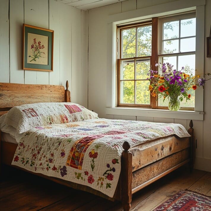 Look for washed linen, quilted cotton, anything softened by time or touch. When a floral pattern meets a fabric that already feels kind, the comfort becomes physical.