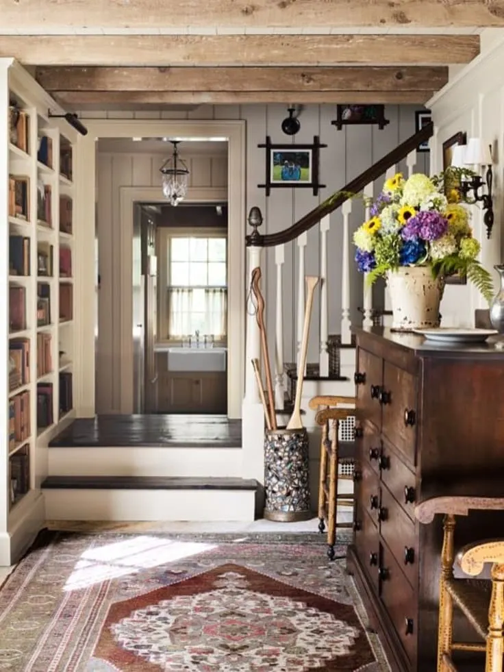 PHOTO: @circawdm on Instagram. This entryway is an excellent example of design with books and wooden furniture.