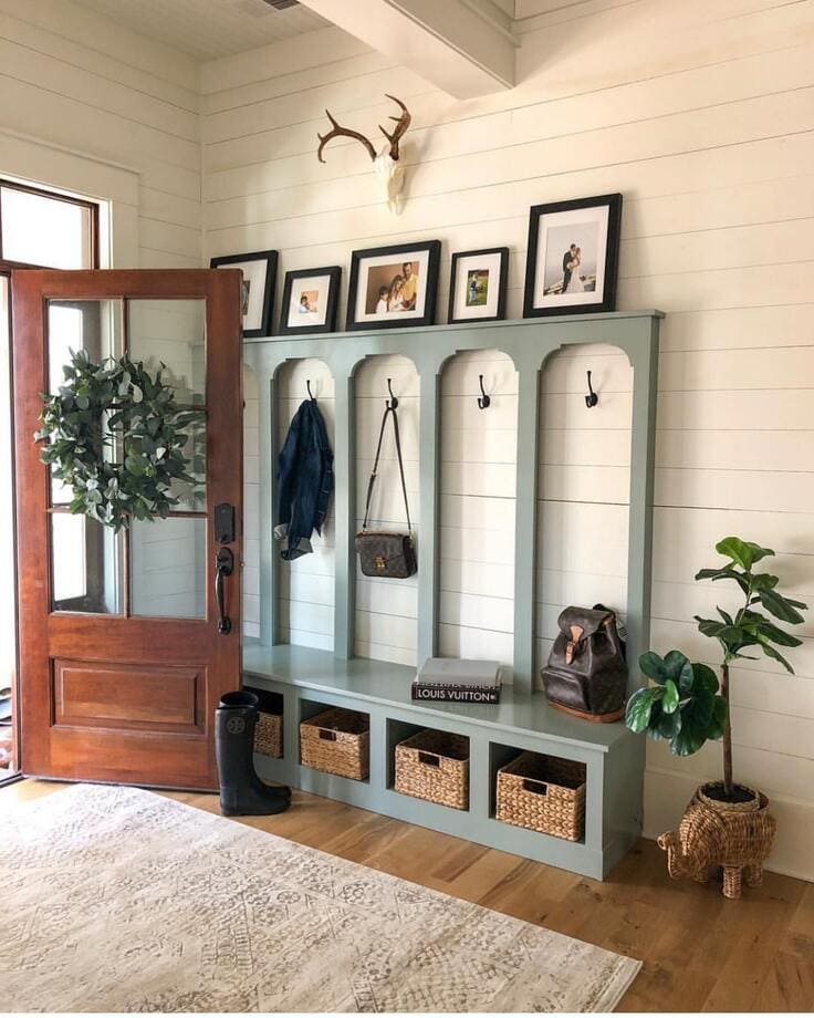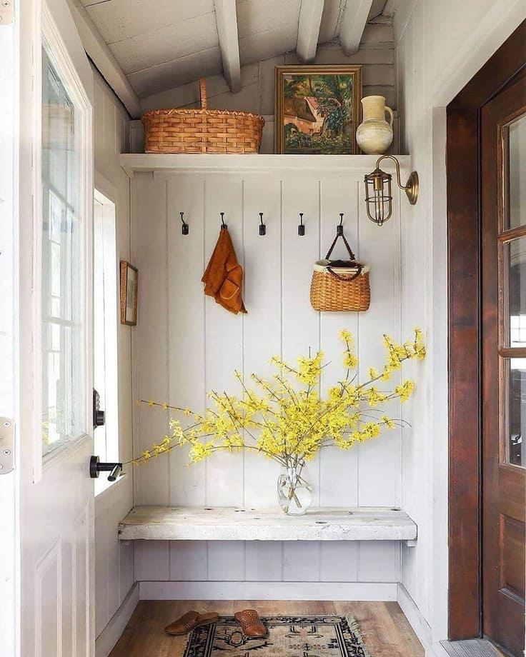 Add a narrow bench, a few hooks, or one additional, even easier hanging system, two baskets, and a shelf for keys. Bright shades make the space feel larger.