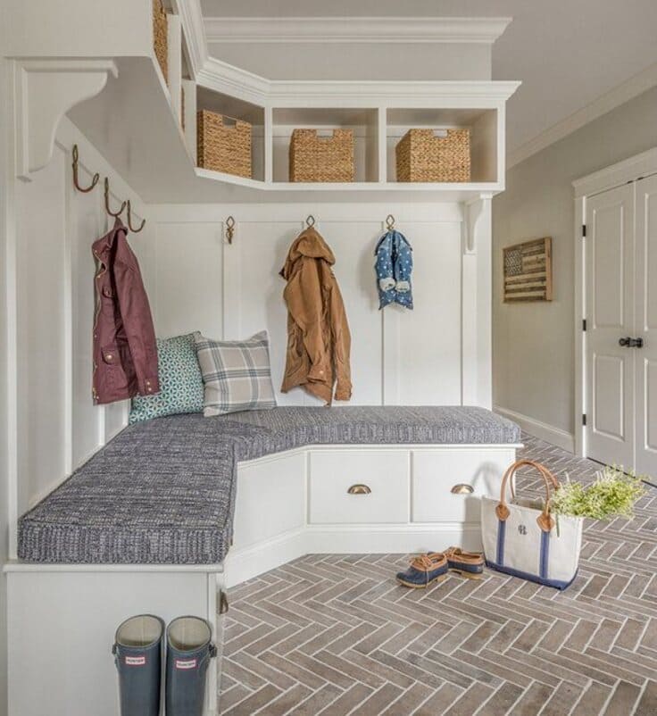 Excellent storage. Hooks, baskets, and a bench are the holy trio. They do the heavy lifting and keep everything tidy with almost no effort on your part.